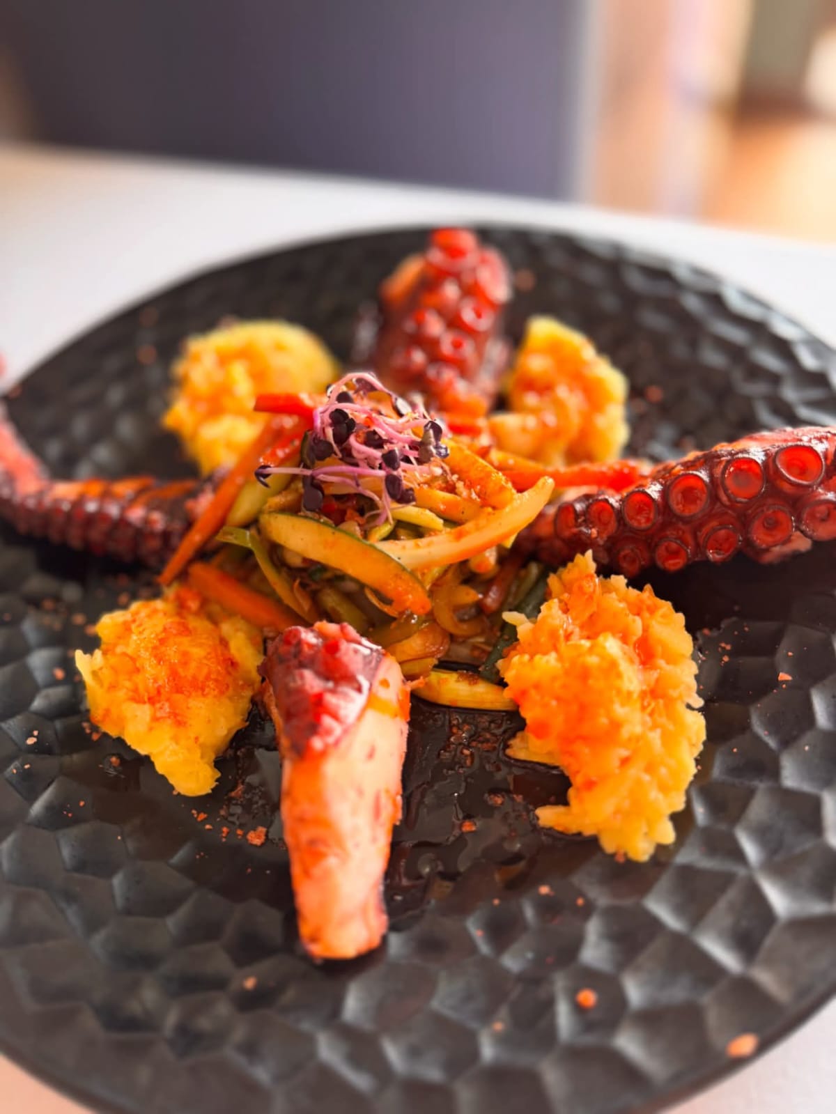 - Pescados y mariscos. Selección de pescado y marisco fresco: calamares de playa tiernos, lenguado y rodaballo de sabor delicado, y pulpo suave a la brasa. Preparación sencilla, toques mediterráneos y aromas marineros que evocan los chiringuitos y la cocina tradicional junto al mar.